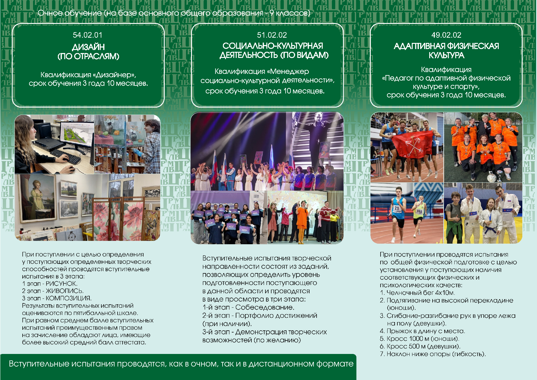 - Преподавателях и учебном процессе. Абитуриенты познакомятся с членами приёмной комиссии, руководителями отделений и преподавателями, узнают об используемых методиках обучения.