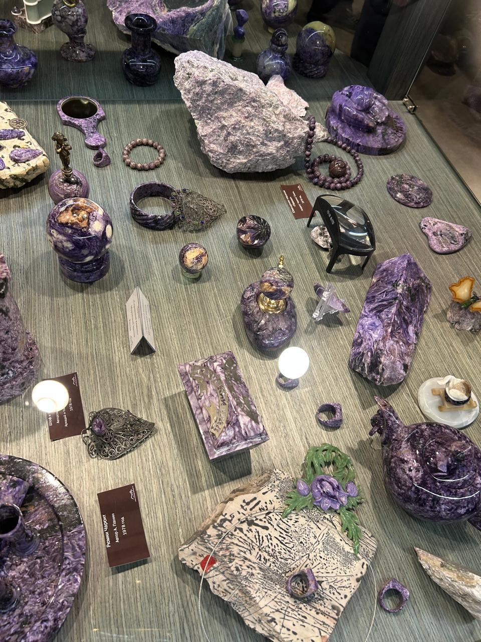 В ходе экскурсии присутствующие посмотрели музейную выставку и познакомились с информацией о самоцветах и минералах, которые встречаются в Иркутской области (лазурит, лароит, серафинит, нефрит, офикальцит, слюда и др.) Некоторые из которых используются в дизайне интерьеров, какие-то обладают лечебными свойствами.